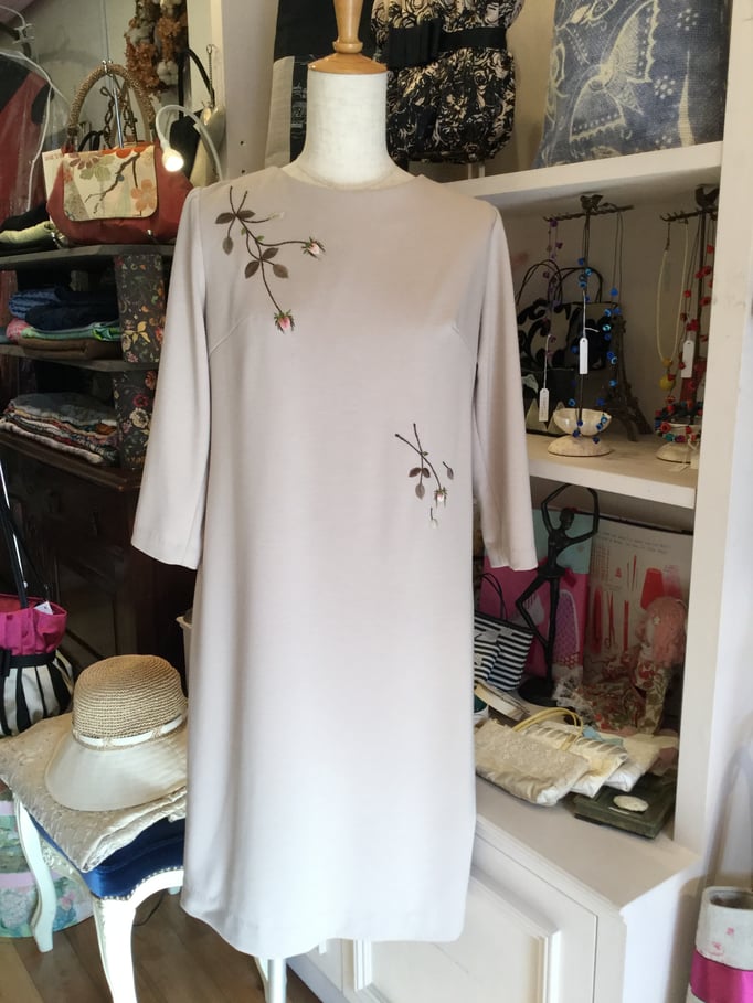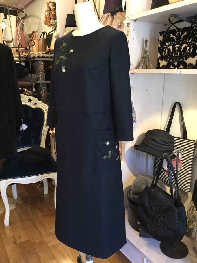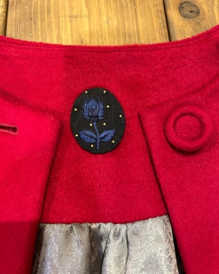 ボタンの二重のくるみボタンを付けています。タグは手刺繍の紺のバラを刺して落ち着きをだしました。末長く着ていただけます様に。