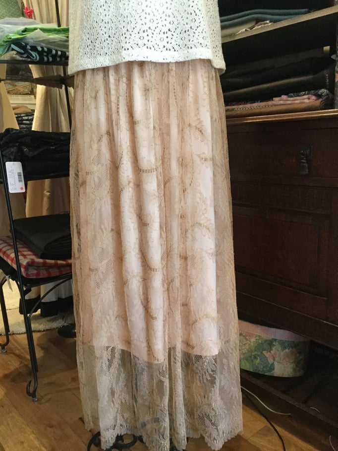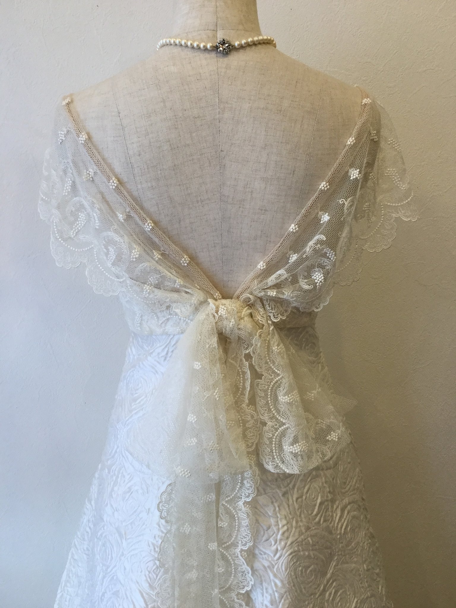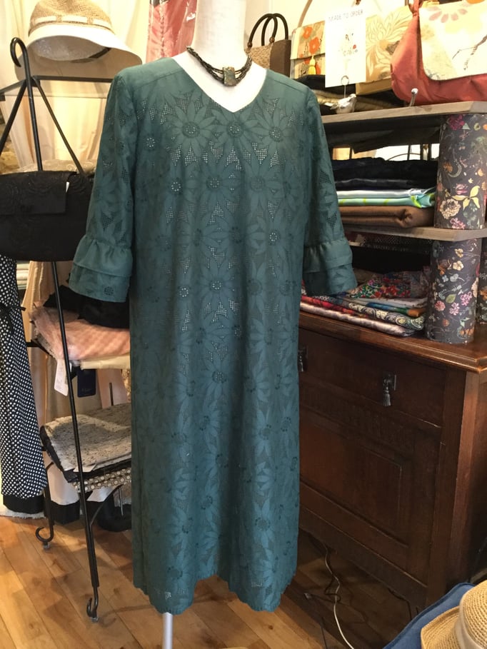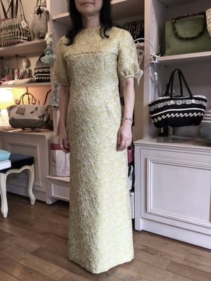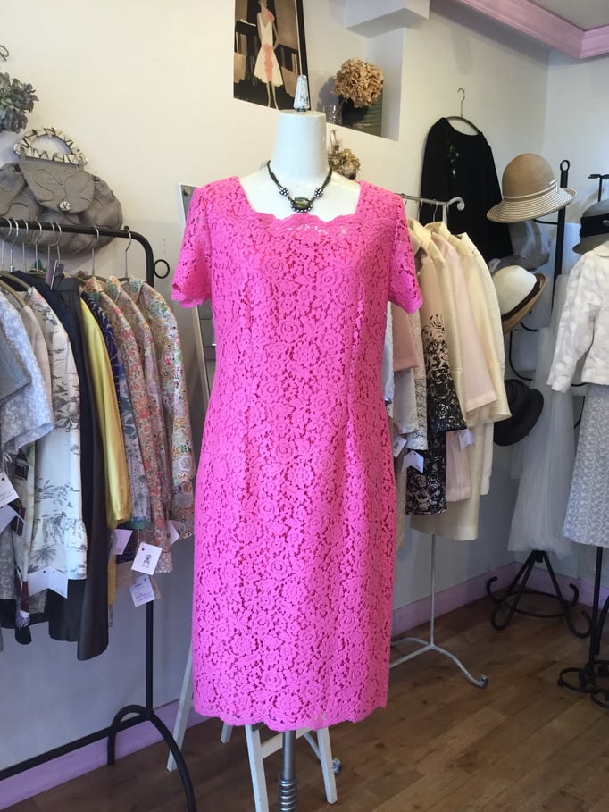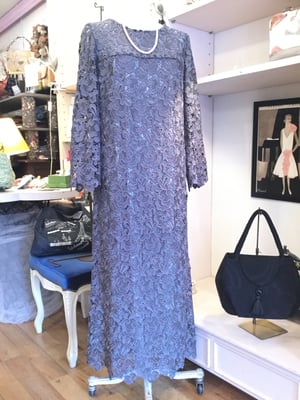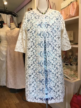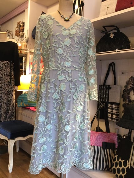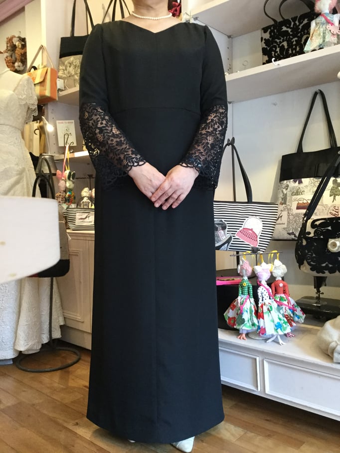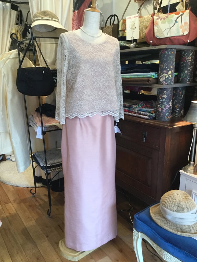 ビンテージ風の素敵な色合いのレースに裏にグレーの裏地を付け、落ち着いた上品なオンピースに仕上がりました。