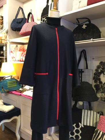 赤い前ファスナーをつけてみました。紺と赤のコントラストが可愛いです。